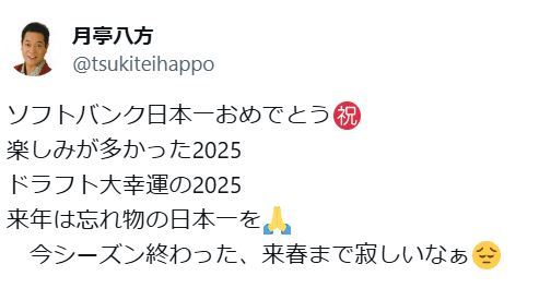 「ソフトバンク日本一おめでとう 楽しみが多かった2025 ドラフト大幸運の2025 来年は忘れ物の日本一を 今シーズン終わった、来春まで寂しいなあ」と記した。