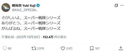 声優の梶裕貴が31日までにX(旧ツイッター)を更新。テレビ朝日系で放送されている特撮ヒーロー番組「スーパー戦隊シリーズ」が終了するとの報道に言及した。