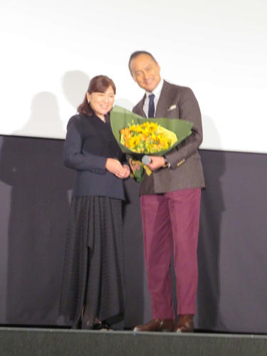 映画「盤上の向日葵」初日舞台あいさつで、原作者の柚月裕子氏から花束を贈られた渡辺謙(撮影・村上幸将)