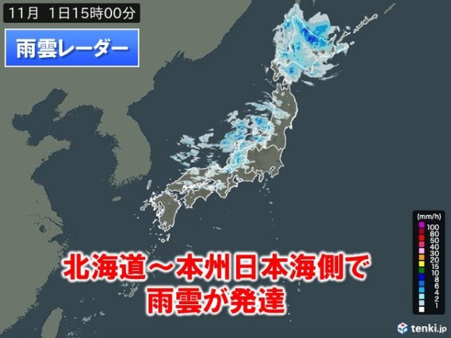 今日11月1日(土)は、低気圧や上空の寒気の影響で、北海道と本州の日本海側で雨雲・雷雲が発達しやすくなっています。北海道や東北、北陸では今日1日(土)の夜にかけて大雨に注意・警戒が必要です。また、東北、北陸・近畿などでは3日(月・祝)にかけても、大気の不安定な状態が続く見込みです。