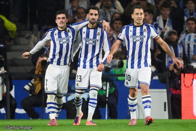 戦列を離れていたレアル・ソシエダのMF久保建英が久々に招集メンバー入りを果たした一戦は、立ち上がりから強度の高いぶつかり合いが繰り広げられる展開に。そんな中で先手を奪ったのはホームのレアル・ソシエダ。38分、左サイドからアンデル・バレネチェアが折り返したボールをボックス左のミケル・オヤルサバルがヒザ先に当ててコースを変えると、ニアサイドに走り込んだブライス・メンデスが右足でシュート。一度はGKウナイ・シモンに阻まれるも、こぼれたボールをメンデスが押し込んで先制した。