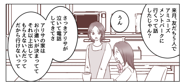 私はモモコ。娘のユウは高校1年生です。ユウには小さい頃から仲が良く、高校でも同じクラスになったアリサちゃんという友だちがいます。アリサちゃんのお母さんは倹約家で、ママ友ランチのお誘いにはあまり乗らなかったタイプ。ママ友たちで遊びに行く企画があったときも、お金がかかる場所は断ってきていた記憶があります。ユウは今度アリサちゃんも含めた5人グループで、アミューズメントパークへ遊びに行くという話だったのですが……?