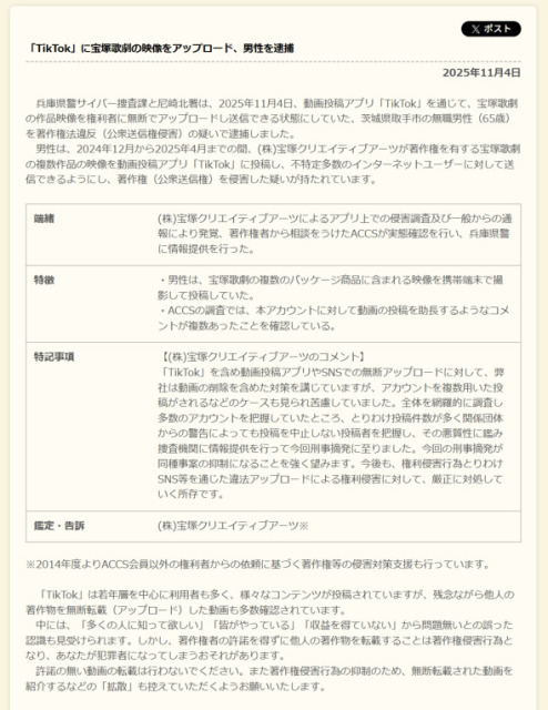 ニュースリリースより コンピュータソフトウェア著作権協会(ACCS)によると、兵庫県警は11月4日、宝塚歌劇の作品映像を権利者に無断でTikTokにアップロードしていた茨城県の無職の男(65)を、著作権法違反(公衆送信権侵害)の疑いで逮捕した。