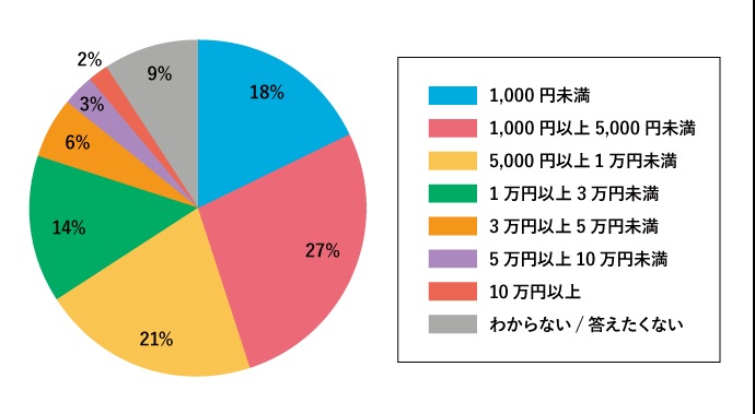 ¤Þ¤¿¡¢¿ä¤·³è¤Ë¤«¤±¤ë¤ª¶â¤ÎÊ¿¶Ñ¶â³Û¡Ê·î³Û¡Ë¤ÇºÇ¤â¿¤«¤Ã¤¿¤Î¤Ï¡Ö1000±ß°Ê¾å5000±ß̤Ëþ¡×¡Ê27¡ó¡Ë¡£¼¡¤¤¤Ç¡Ö5000±ß°Ê¾å1Ëü±ß̤Ëþ¡×¡Ê21¡ó¡Ë¡¢¡Ö1000±ß̤Ëþ¡×¡Ê18¡ó¡Ë¡¢¡Ö1Ëü±ß°Ê¾å3Ëü±ß̤Ëþ¡×¡Ê14¡ó¡Ë¤È¤¤¤¦·ë²Ì¤Ë¤Ê¤Ã¤¿¡£