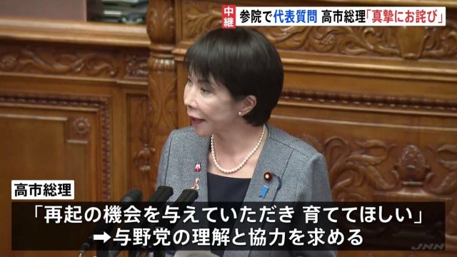 高市総理は国会運営に混乱が生じていることについて「真摯にお詫び申し上げる」と陳謝した上で、「再起の機会を与えていただき、育ててほしい」と与野党の理解と協力を求めました。