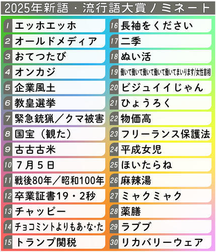 激動の1年を代表する言葉を選ぶ「現代用語の基礎知識選 2025 T&D保険グループ新語・流行語大賞」のノミネート30語が5日、発表され、X(旧ツイッター)では、さまざまな声があった。