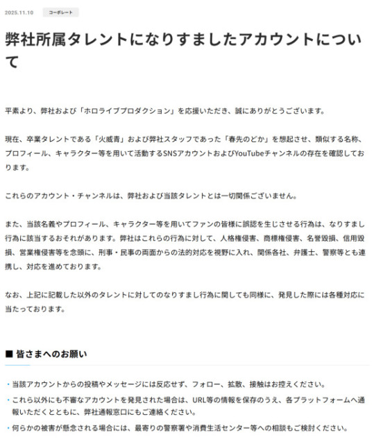 ホロライブは、元所属タレントなどの名義やプロフィール、キャラなどを用いてファンに誤認を生じさせる行為は、「なりすまし行為に該当するおそれがある」とし、刑事・民事の両面からの法的対応を視野に入れて対応を進めるとしている。
