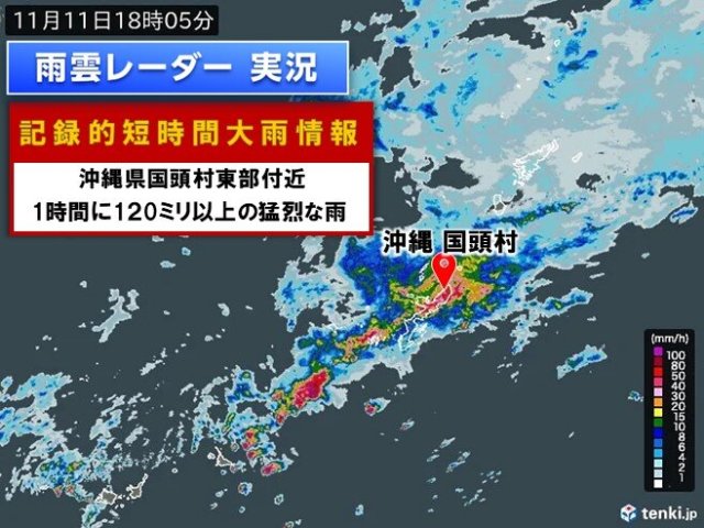 沖縄県国頭村東部付近では、今日11日午後6時までの1時間に120ミリ以上の猛烈な雨が降ったとみられ、「記録的短時間大雨情報」が発表されました。