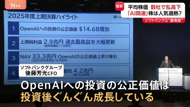 AI関連の投資が利益を大きく押し上げたことで、最終利益は去年の2.9倍にあたる2兆9240億円となり、中間決算として過去最高益を記録しました。