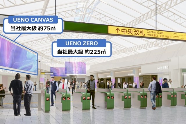 2026年春には、グランドコンコースに同社最大級となるゼロカーボンメディア「UENO CANVAS」(約75平方メートル)と、ショールーミング空間「UENO ZERO」(約225平方メートル)を整備。照明・映像・音が調和する新しい鑑賞空間を創出し、東京や地域の文化的価値を発信する拠点とする。上野広小路口ビジョンやポレイア広場といった既存の文化発信拠点とも連携し、駅全体をリアルな「文化創造HUB」として一体運用する。