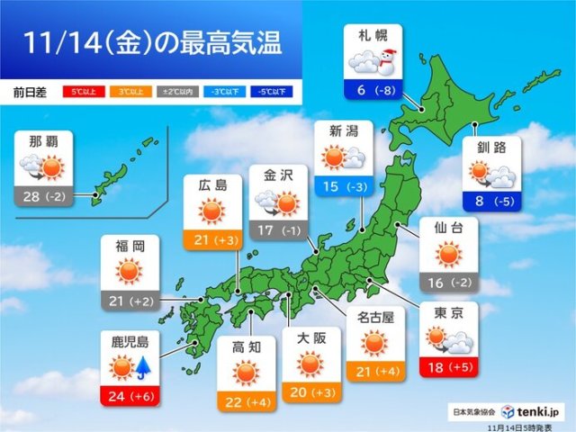 今日14日の最高気温は、九州から関東では昨日より高いでしょう。鹿児島市では24℃と夏日に迫るくらいとなりそうです。福岡市や名古屋市では20℃以上で、過ごしやすい陽気でしょう。東京都心は18℃と昼間は日差しが暖かく感じられそうです。ただ、夜は冷え込みますので、服装で上手に調節してください。