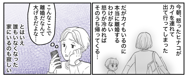 マナは「自分のせいで離婚なんてされたら困る」と思っているようだ。ヒナコに謝るべきだときつく叱られ、オレは何も言い返せなかった。そして、悪いのはヒナコでもマナでもなく、自分自身だったことをようやく理解したのだった……。