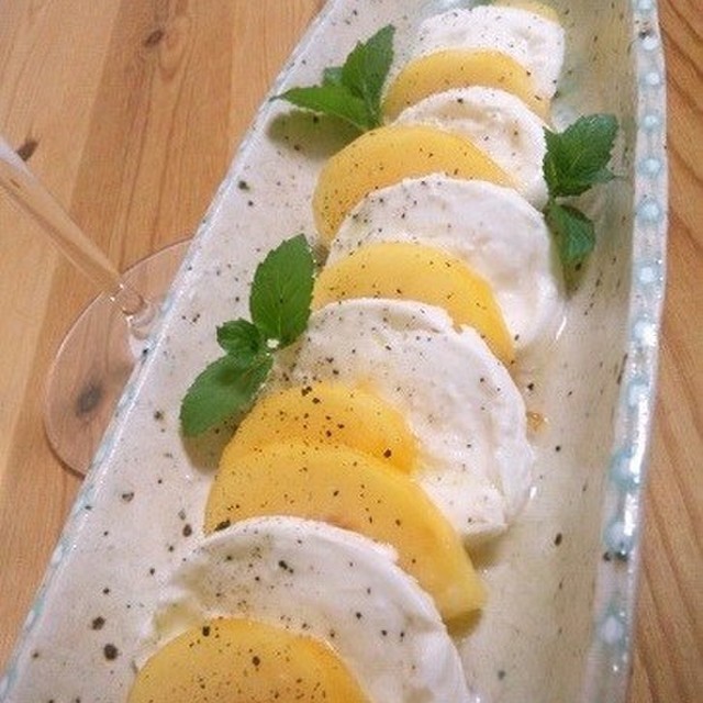 ワインとの相性ぴったりの「モッツァレラと柿」。柿をカットして、モッツァレラと交互に並べ、ビネガーとオリーブオイル、塩コショウをするだけでお店のような味に!
