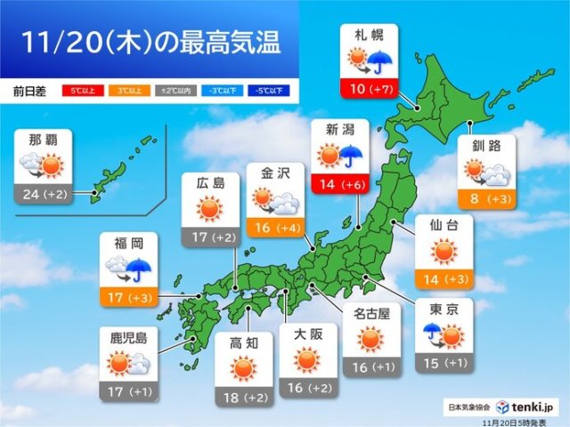 九州から東海は昨日より1〜3℃ほど高く、17℃前後の所が多いでしょう。北または西よりの風が吹く時間が長く、体感温度が下がりそうです。関東は昨日と同じくらいか高く、東京都心は15℃の予想。横浜は14℃など、12月上旬並みの所もあり、昼間も厚手の上着が必要でしょう。