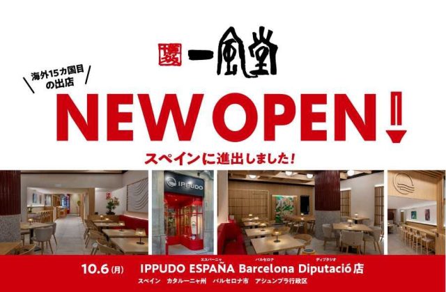 ラーメン店「一風堂」を運営する力の源ホールディングスは、「IPPUDO ESPAÑA Barcelona Diputació店」を10月6日に開業した。
