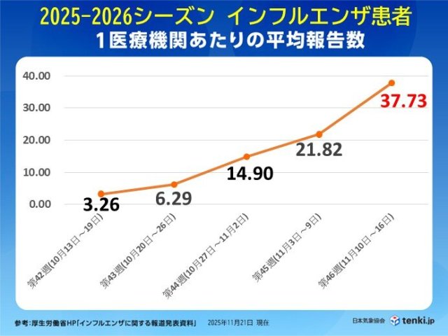 º£Æü21Æü¡¢¸üÀ¸Ï«Æ¯¾Ê¤Ï¡Ö¥¤¥ó¥Õ¥ë¥¨¥ó¥¶¤Ë´Ø¤¹¤ëÊóƻȯɽ»ñÎÁ¡×¤òȯɽ¤·¤Þ¤·¤¿¡£ÎáÏÂ7ǯÂè46½µ(11·î10Æü¤«¤é16Æü¤Þ¤Ç)¤Î¥¤¥ó¥Õ¥ë¥¨¥ó¥¶¤Î»ØÄê°åÎŵ¡´Ø¤ÎÊó¹ð¿ô¤Ï¡Ö145,526¡×¤Ç¡¢Á°¤Î½µ¤ÎÌó1.7ÇܤȤʤê¤Þ¤·¤¿¡£ÄêÅÀÅö¤¿¤êÊó¹ð¿ô¤Ï¡Ö37.73¡×¤È¤Ê¤Ã¤Æ¤¤¤Þ¤¹¡£¤³¤ÎÀè¡¢ÂÀÊ¿ÍΦ¤Ç¤ÏÀ²¤ì¤ëÆü¤¬Â¿¤¯¡¢¶õµ¤¤Î´¥Á礬¿Ê¤ß¤Þ¤¹¡£¥Î¥É¤Î¥±¥¢¤Ê¤ÉËüÁ´¤Ë¤Ê¤µ¤Ã¤Æ¤¯¤À¤µ¤¤¡£