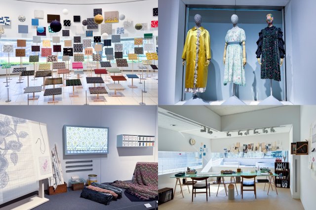 会場は、世田谷美術館の1階・2階展示室を舞台に6つのパートで構成。1つ目のパート「コーラス(chorus)」では、1995年のブランド創業以来、洋服をフォルムではなく布地から作りはじめることを続けてきたミナ ペルホネンがこれまでにデザインした1000種を超えるテキスタイルの中から、約180種類を厳選して展示。「花」や「鳥」といったモチーフの共通点や、「幾何学」「プリズム」といったデザインの発想源に注目したテーマをもとに選定されたテキスタイルの数々を通して、柄から柄へとデザインが派生していく様子や、一つのデザインが素材の変化や技術の革新などを経て形を変えていく様子などを見ることができる。