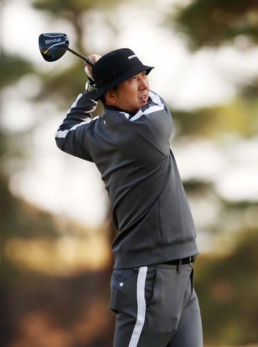 ティーショットを放つ阪神藤川監督(撮影・前田充)