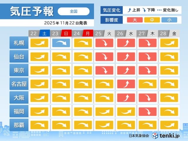 特に影響度が大きいのは、25日(火)から27日(木)。25日(火)は北海道の北を低気圧が発達しながら進むため、札幌や仙台、東京で「下降」による影響度が「大」となっています。26日(水)は気圧が上昇した後、27日(木)から28日(金)は低気圧が日本海から北海道付近に進むため、全国的に気圧が下がる傾向。27日(木)は札幌や東京、大阪などで影響度「大」です。