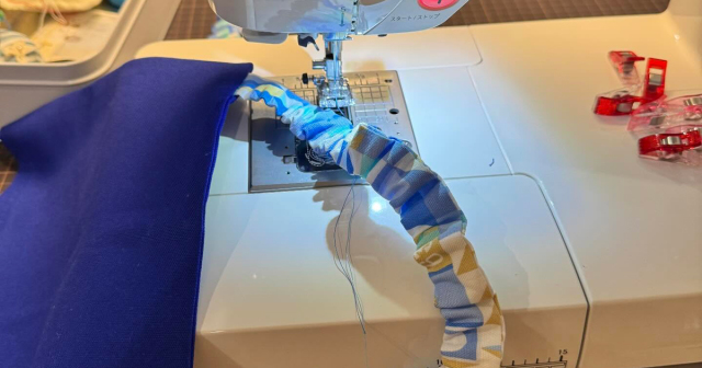 インターネット上で公開されている作り方を参考に、夜9時から夜11時までの約2時間で完成させました。鮮やかな青色が目を引くデザインで、肩ひも・腰ひもはディズニーランドの「イッツ・ア・スモールワールド」がデザインされたカットクロスを使用。まるで高級感のある衣装のようで、子どもが喜びそうな見た目です。
