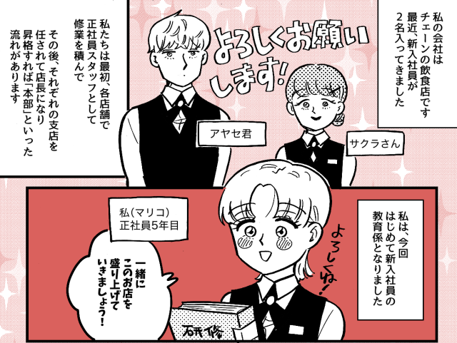 私は正社員スタッフとして働いて5年。今回はじめて新入社員の教育係となりました。2人もマニュアル通りにやってくれるので、従業員やお客さんへの態度が悪いわけでもありません。