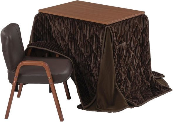 こたつテーブル、掛け布団、チェアがセットになっている商品。こたつテーブルは石英管ヒーターを搭載しており、サイズは約70.2(幅)×約49.2(奥行き)cmです。1人暮らし用の製品で、パソコンや資料を広げてテレワークを行う時に便利です。
