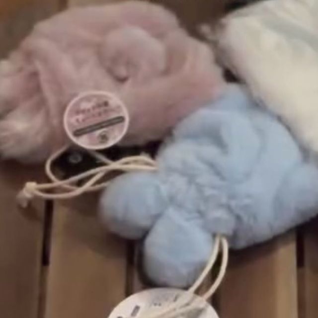 購入したのは、ふわふわ素材のラビット巾着と人形用の白い布団、クラシックカラーフェルトと、白・黒・茶色のフェルト。このラビット巾着という商品が、耳付きで色味もトトロにそっくり……! なみさんはブルーとピンクの子を選びました。