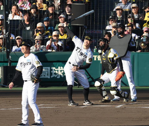 現役選手、現役監督による夢の対決となり、藤川監督はボールを突き出し、直球勝負を宣言。1球目は背中側に大きく外れ、2球目も背中側に大きく外れるボールも、球審今朝丸はストライク判定。最後は低めのボールを佐藤輝が救い上げるように打ち、右前打とした。