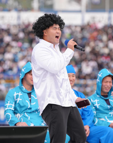 大トリで登場。アフロヘアのカツラを被り、フルコーラスを歌いきった。「大都会」と言えば、高津前監督が現役時代に熱唱する姿が「珍プレー好プレー」で何度も放送され、ヤクルトファンにはなじみ深い。その名曲を“カバー”し、球場を盛り上げた。