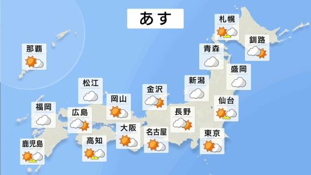 あすの天気です。太平洋側を中心に晴れる所が多いでしょう。空気の乾燥が続くため、火の取り扱いにご注意ください。札幌は晴れますが、東北から九州にかけての日本海側は雲が広がりやすく、にわか雨や雷雨の所がありそうです。夜は、九州南部でも雨の降る所がある見込みです。