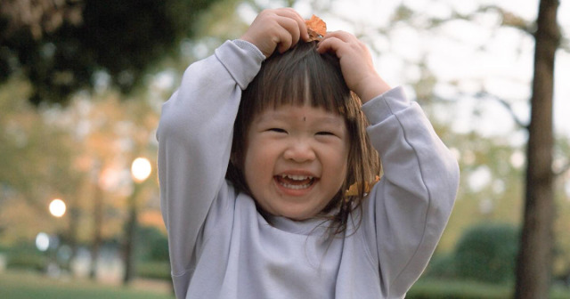 それは落ち葉を持った手を頭の上に乗せ、無邪気に笑っている愛らしい1枚。葉が散り、黄色く染まり始めた木々を背景に、藤色の服を着た娘さんがうれしそうに顔をほころばせています。外でも過ごしやすいわずかな時間を大好きな家族と一緒に楽しんでいることがこの1枚から伝わってくるようです。