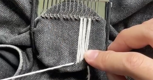 今回注目を集めているのは、グレーのジーンズの正面部分にワンポイントを入れていく動画です。まずはダーニングマシンで生地を挟み込んで、刺しゅうを入れたい箇所を固定。太めの白い糸を針に取って、縦糸から差していきます。