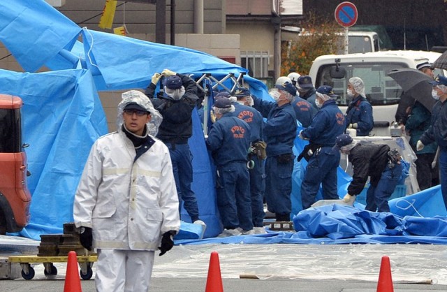王将フードサービスの大東隆行社長が撃たれた現場周辺を調べる捜査員ら=京都市山科区で2013年12月19日午前9時9分、森園道子撮影