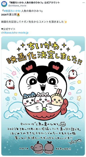 イラストレーター・ナガノがSNS上で連載している漫画『ちいかわ』の映画『ちいかわ 人魚の島のひみつ』が2026年夏に公開されることが11月24日に発表された。