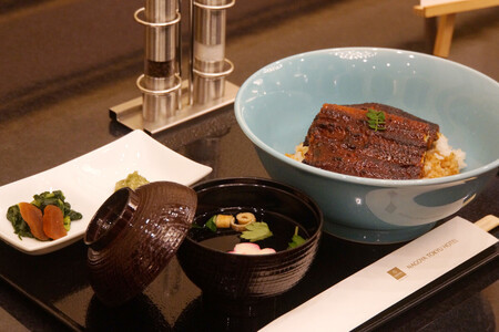 養殖メスウナギを使用したうな丼など=18日、名古屋市中区 愛知県水産試験場の内水面漁業研究所(西尾市)などが開発したウナギの「メス化技術」への期待が高まっている。ウナギの稚魚は養殖すると9割以上がオスに育つが、エサの工夫でほぼ全てをメスにすることに成功。メスはオスの倍ほどの重量に育ち、資源の有効活用にもつながる。大手スーパーが取り扱いを始めるなど流通も拡大している。
