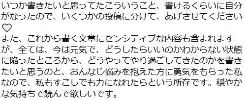 受診した病院で「パニック障害」と診断され、「『ですよねぇー!』という感じで、自分のこれは、私自身ではなく、症状によるものだ。と言ってもらえたことで、まず救われました」と当時の率直な思いを記述。その後、自身はエレベーターや電車など閉鎖された空間に立ち入ることで発作が特に起きやすいことからそうした場所を避けて生活するようになり「もう、ほんっっとに苦しい毎日。当たり前のことが当たり前に出来ないから、友達も減りました。だって会う約束したって、その約束の時間に約束の場所に辿り着ける自信ないから、会えないし。タクシーばかり使ってしまうので、お金もどんどん減ってしまって、そのために働くみたいな感じ。自然と私は外出をすることを諦めていきました」と苦労をつづった。