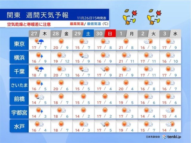 ¤³¤ÎÀè¡¢1½µ´Ö¤ÎºÇ¹âµ¤²¹¤Ïʿǯʤߤ«¹â¤¯¡¢28Æü(¶â)¤È12·î1Æü(·î)¤Ï20¡î¤¯¤é¤¤¤Þ¤Ç¾å¤¬¤ë½ê¤â¤¢¤ë¤Ç¤·¤ç¤¦¡£Ãë´Ö¤ÏÆüº¹¤·¤¬ÃȤ«¤¤¤Ç¤¹¤¬¡¢Ìë¤ÏË̤è¤ê¤ÎÎ䤿¤¤É÷¤ËÊѤï¤Ã¤Æ¡¢Ä«¤è¤ê¤â´¨¤¯¤Ê¤ê¤½¤¦¤Ç¤¹¡£