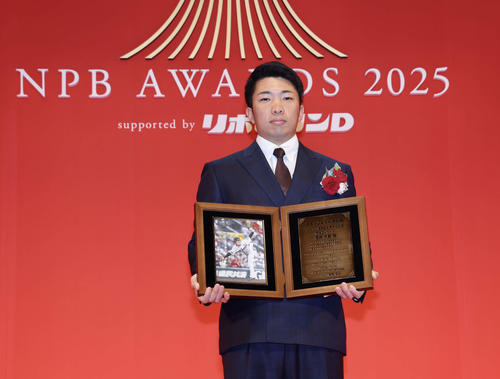コミッショナー特別表彰を受ける阪神石井(撮影・河田真司)<NPB AWARDS 2025 supported by リポビタンD>◇26日◇グランドプリンスホテル新高輪