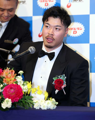 黒のタキシードに蝶ネクタイ。ひげを伸ばして“ちょい悪風”に変身した佐藤輝は、何度も支えてくれた人たちへの「ありがとう」を口にした。得票は両リーグ唯一の1000点超えの1308点。MVPの初受賞が発表されると大きな拍手が起こり、スピーチでは家族への感謝を伝えた。