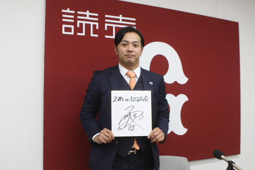 色紙に書いた来季の目標は「2桁or50試合」。先発なら2桁勝利、中継ぎであれば50試合出場を見据えた。「キャンプには先発で合わせていこうかな。シーズン入ったらわからない」とチームの勝利に貢献できる役割を全うする。