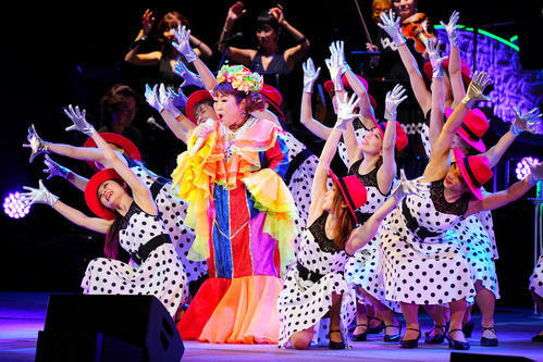 第1部は12人の華麗なラインダンスで華々しく幕を開け、「東京ブギウギ」で歌唱をスタート。カラフルなハットとロングドレスで何度も自慢の声を張り上げ、衣装を変えた後は「哀愁列車」「古城」などを続けた。
