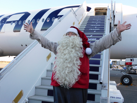 サンタは赤い帽子、衣装に真っ白なあごひげとおなじみの姿で旅客機から登場。大きく手を振り、豪快に笑いながら「メリークリスマス」と呼び掛けた。「1年で一番忙しい時期を前にトナカイを休ませないといけないので、きょうは飛行機で来た」と冗談を言うと、日本の子どもに向けて「優しく、いつも楽しい心で日々を過ごして」とメッセージを送った。