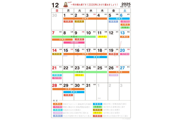 画像提供:マイナビニュースリーチゼムは、運営する占い専門メディア「zired」で「吉日カレンダー 2025年12月版」をリリースした。