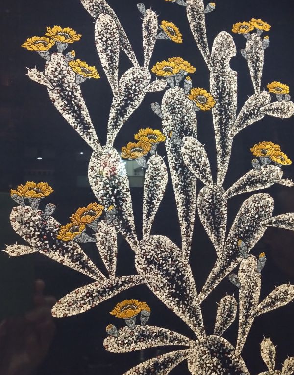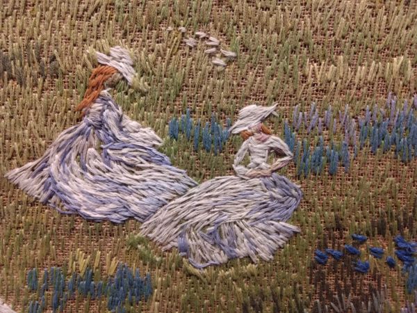 5人の作り手による100点を超える作品が展示されており、素人手芸の世界しか知らなかった筆者は、刺しゅうの多様性にまず驚かされた。日本の伝統的刺しゅう技法を継承する平野利太郎氏の作品からスタート。すでに、これは刺しゅうなのかと作品に顔を近づけて目を凝らしてしまうような「サボテン」に圧倒される。絵画を描くように、麻地に毛糸を刺して風景や人物を表すフリーステッチを考案した尾上雅野氏の作品群は、まるでモネやルノワールなど印象派の絵画を思わせるタッチ。子細に見れば、一針一針、さまざまな色の糸が草原の草や女性のドレスの微妙な色合いを作っていて、印象派の「筆触分割」に似た質感を生んでいるのかもしれない。