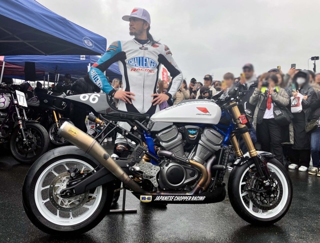 長瀬さん(中央)のマシンはアメリカのハーレーダビッドソンの大型ツーリングバイク、Pan America。これをベースにサーキット仕様に改造してレース参戦し、富士スピードウェイで開催された クラブマンロードレース第2では2位表彰台を獲得している