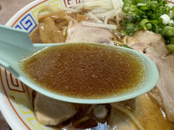強い醤油の味わいながら奥行きのあるスープの味わいは、もうひとくち、もうひとくち、と食欲を掻き立ててくれるのだ。