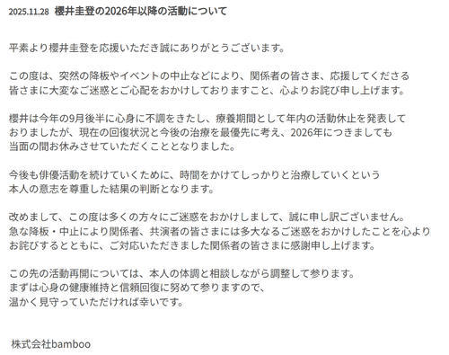 芸能プロダクション株式会社bambooが30日までに公式ホームページ(HP)を更新。年内の活動休止を発表している俳優の櫻井圭登(32)が、26年の活動についても当面休養することを発表した。