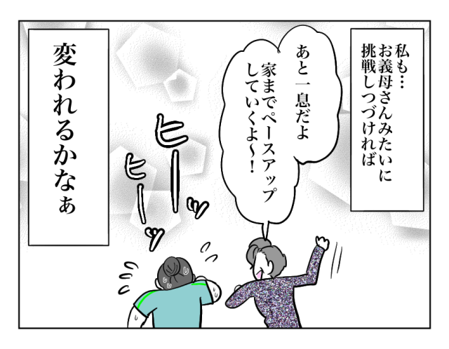 お義母さんに「あまり派手な格好はやめた方がいい」なんて口を出してしまったことを、クミさんはあらためて謝りました。個性的な格好も派手なウェアも、お義母さん自身の個性だし誰に迷惑をかけているわけでもありません。クミさんは本人の意志を尊重しようと決めたのですね。お義母さんも冗談まじりにそんなクミさんの気持ちを受け取ってくれました。以前より2人の絆が深まったように見えますよ?