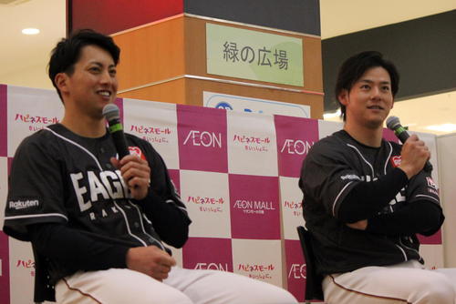 伊藤裕とともに宮城・石巻市内の商業施設でトークショーを開催。オフの過ごし方に話が及ぶと「基本的に4時半に起きて、そこから練習して7時半ぐらいに家帰って。娘の幼稚園のバスの送迎に行って、そこからまた下の子と遊んで、昼ご飯前ぐらいにちょっと寝て、夜9時に就寝する感じ」と説明。「午前中まで寝て、昼からもう1回寝る」と発言した伊藤裕とは対照的だった。