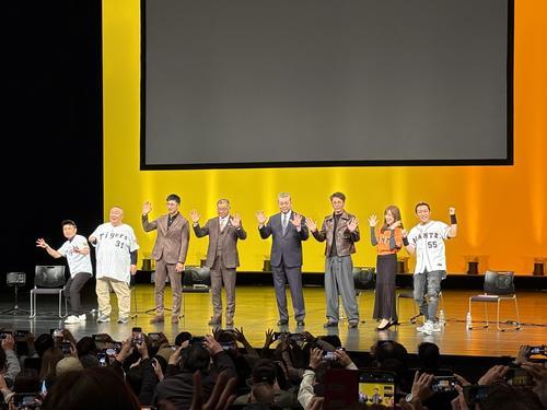 「阪神VS巨人爆笑トークバトル2025」に出演した、左からますだおかだ増田、松村邦洋、矢野燿大氏、掛布雅之氏、江川卓氏、元木大介氏、中川安奈、はなわ